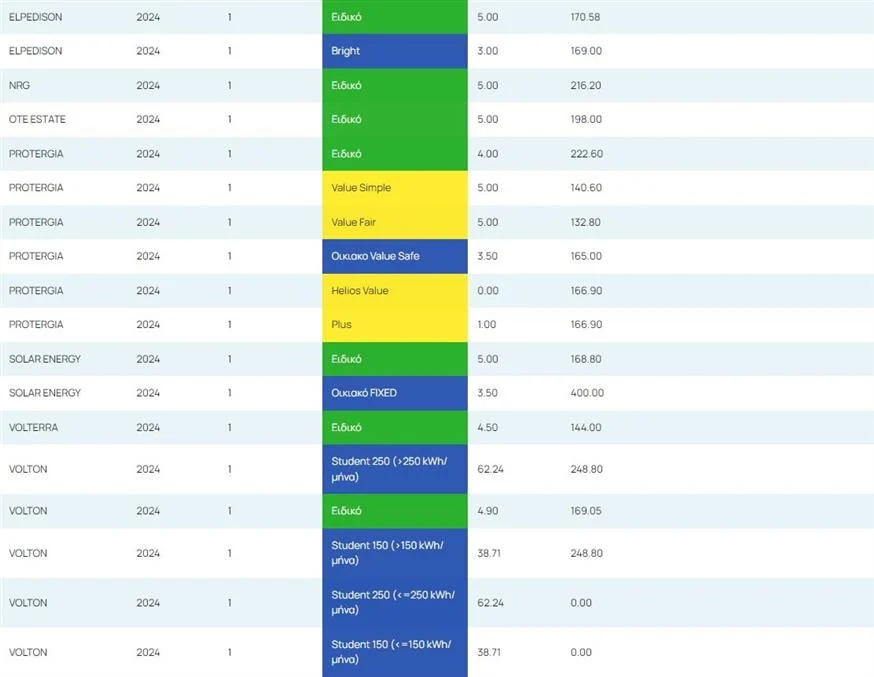 Σύμφωνα με τα στοιχεία αυτά, οι χρεώσεις για τα πράσινα τιμολόγια κυμαίνονται από 13,635 έως 19,8 σεντς ανά κιλοβατώρα, ενώ τα μπλε (σταθερά) κλιμακώνονται από 14,9 έως 36 σεντς και τα κίτρινα (όσα έχουν ανακοινωθεί) από 12,653 έως 16,69 σεντς.