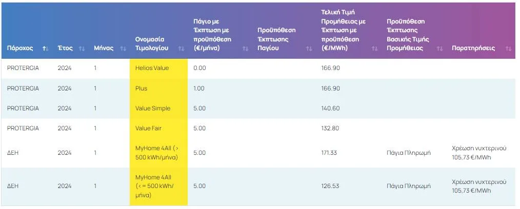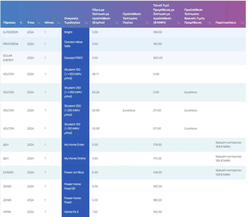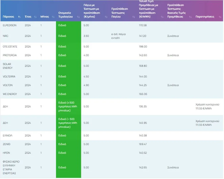 Παράλληλα, ο πίνακας περιλαμβάνει την πάγια χρέωση και την τελική τιμή προμήθειας του σχετικού μήνα, κατόπιν υπολογισμού τυχόν εκπτώσεων. Μάλιστα, για τη διαφανή ενημέρωση των καταναλωτών, αναγράφεται η προϋπόθεση βάσει της οποίας χορηγείται η εκάστοτε έκπτωση.