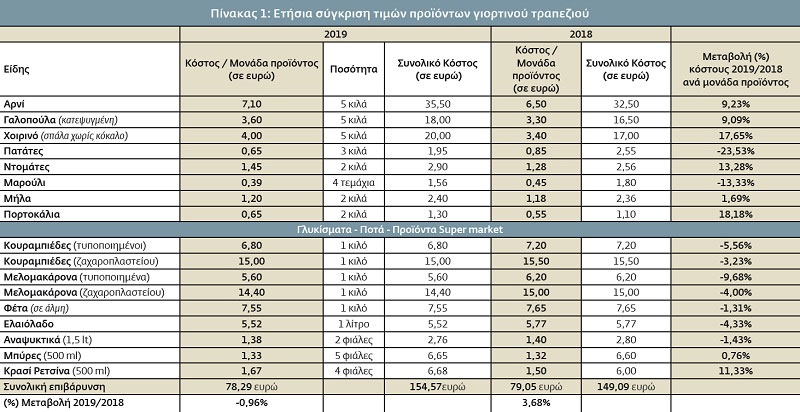 Το κόστος του τραπεζιού τη φετινή εορταστική περίοδο είναι αυξημένο κατά 3,68% σε σχέση με την αντίστοιχη περυσινή περίοδο, με ταυτόχρονη ωστόσο υποχώρηση του μοναδιαίου κόστους των προϊόντων κατά 0,96%. Πιο συγκεκριμένα, το οικογενειακό τραπέζι (6-8 ατόμων) θα κοστίσει φέτος 154,57 ευρώ έναντι 149,09 ευρώ που κόστιζε πέρυσι, ενώ αντίθετα το κόστος ανά μονάδα προϊόντων εμφανίζεται μειωμένο από τα 79,05 ευρώ το 2018 στα 78,29 ευρώ φέτος.