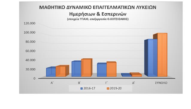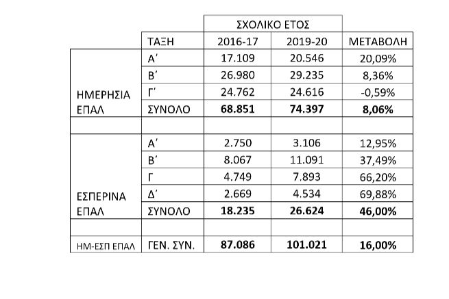 Συγκεκριμένα, μεταξύ 2016-17 και 2019-20 το μαθητικό δυναμικό των ΕΠΑΛ αυξήθηκε κατά 16% (κατά 13.935 μαθητές/-τριες), χωρίς να υπολογίζουμε τους πάνω από 3.000 νέους και νέες που φοιτούν στο νέο θεσμό του μεταλυκειακού έτους – τάξης μαθητείας.