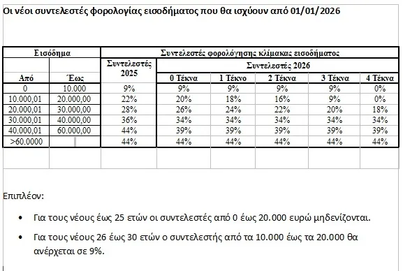 Ο Πίνακας με τους νέους συντελεστές φορολόγησης εισοδήματος