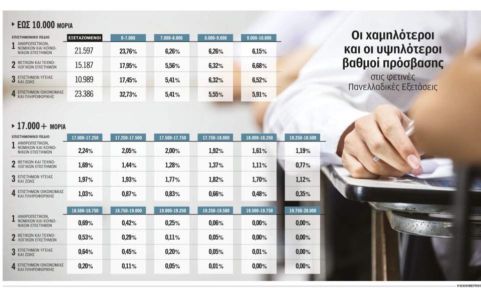 • Το 42,43% των υποψηφίων ανθρωπιστικών και κοινωνικών επιστημών συγκέντρωσε κάτω από 10.000 μονάδες. Το ίδιο συνέβη για το 36,51% των υποψηφίων θετικών σπουδών που διεκδικούσε μία θέση σε πολυτεχνεία και σχολές θετικών επιστημών και για το 35,7% των υποψηφίων για τις σχολές υγείας.