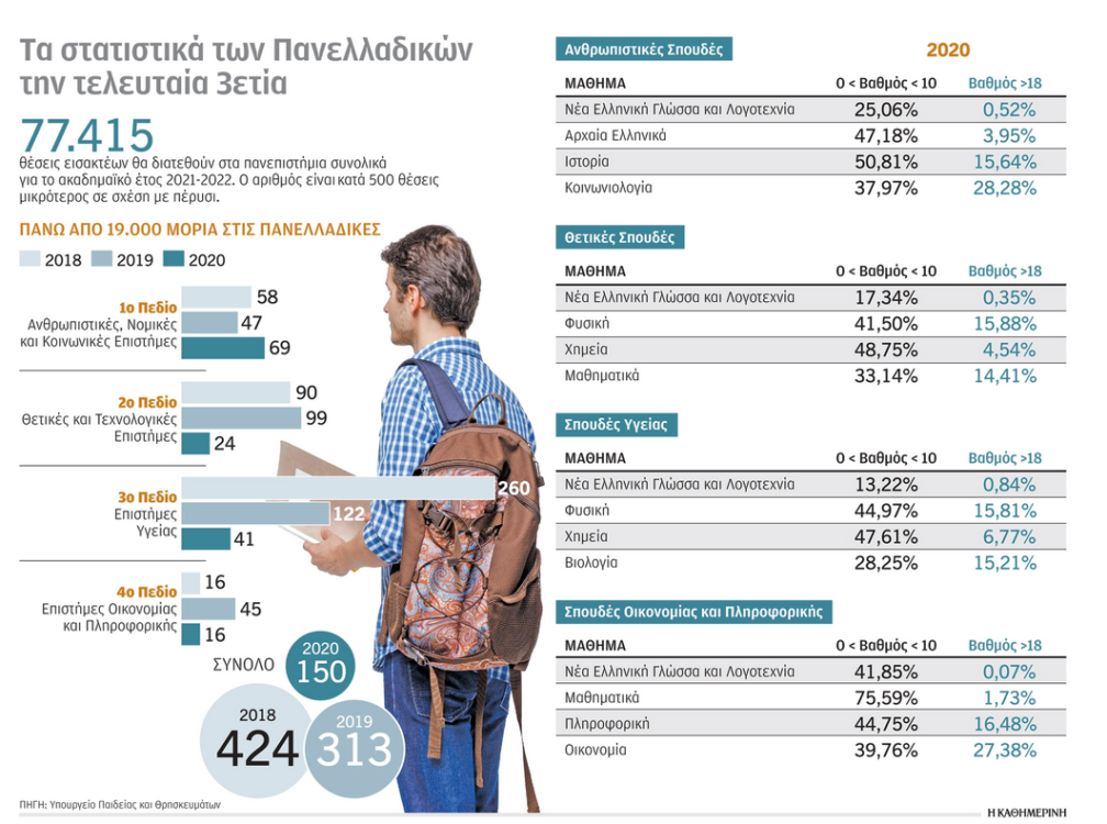 Το 2020, άλλωστε, υπήρξε σε σχέση με το 2019 σημαντική μείωση των εισακτέων στο ανώτατο βαθμολογικό σκαλί, δηλαδή εκείνων που είχαν συγκεντρώσει πάνω από 19.000 μονάδες. Το 2020 στο 2ο επιστημονικό πεδίο ξεπέρασαν το όριο των 19.000 μονάδων 24 υποψήφιοι έναντι 99 το 2019, στο 3ο πεδίο 41 υποψήφιοι έναντι 122 το 2019 και στο 4ο πεδίο 16 υποψήφιοι από 45 το 2019. Μόνο στο 1ο πεδίο οι υποψήφιοι με πάνω από 19.000 μονάδες το 2020 ήταν λίγο περισσότεροι από το 2019 (69 έναντι 47). Τα στοιχεία αυτά συνεκτιμώμενα με τον φετινό βαθμό δυσκολίας των θεμάτων διαμορφώνουν τις προβλέψεις για την τάση των βάσεων.