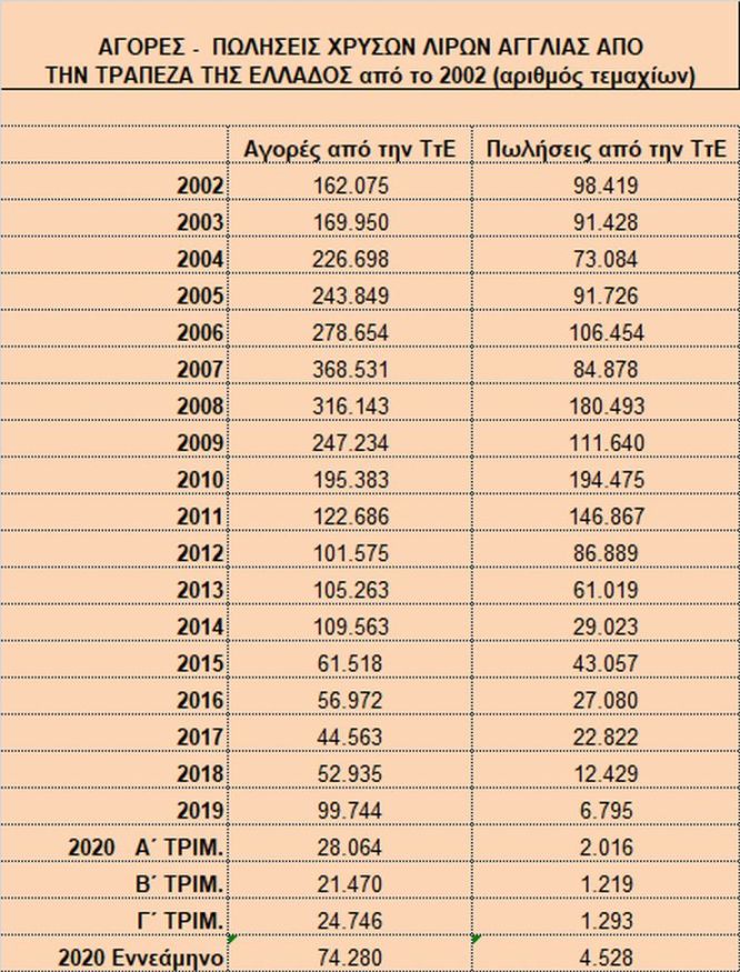 Αντίστοιχα οι αγορές χρυσών λιρών από την Τράπεζα της Ελλάδος στο γ΄ τρίμηνο του 2020 ήταν 1.293 τεμάχια και 4.528 συνολικά στο εννεάμηνο.