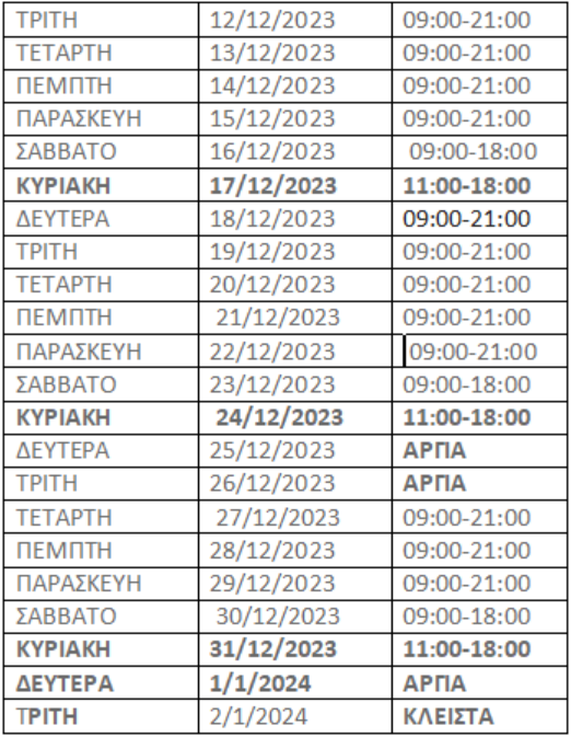 Σύμφωνα, λοιπόν, με την ανακοίνωση, το προτεινόμενο από τον Εμπορικό Σύλλογο Αθηνών ωράριο λειτουργίας των εμπορικών καταστημάτων για την εορταστική περίοδο των Χριστουγέννων 2023, έχει ως εξής: