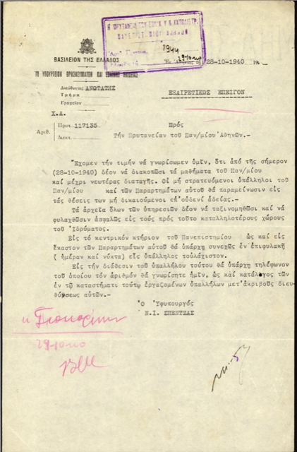 Πρώτος σταθμός είναι φυσικά η εγκύκλιος της 28ης Οκτωβρίου 1940 του υπουργείου Παιδείας για τη διακοπή των μαθημάτων και κυρίως η υπόμνηση της διαφύλαξης του αρχείου του Πανεπιστημίου σε κατάλληλους χώρους του ιδρύματος. Ας μην ξεχνάμε ότι τα επόμενα χρόνια υπήρξαν, όπως αποτυπώνεται στα έγγραφα του Αρχείου, πολλές σημαντικές καταστροφές και κλοπές από τις δυνάμεις κατοχής στους επιταγμένους πανεπιστημιακούς χώρους.