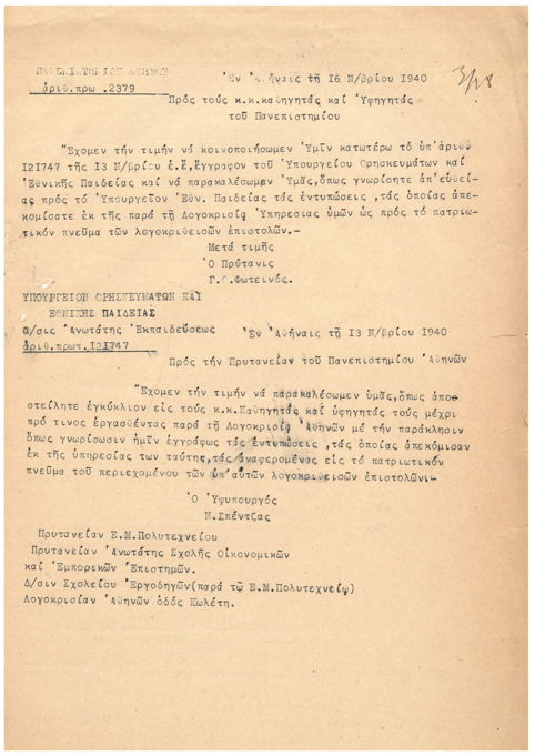 Είναι χαρακτηριστική η επιστολή του υπουργείου Εθνικής Παιδείας και Θρησκευμάτων, που κοινοποιεί ο Πρύτανης του Πανεπιστημίου Αθηνών σε όλους τους καθηγητές, ώστε οι τελευταίοι να γράψουν τις εντυπώσεις τους από τις λογοκριμένες επιστολές σε σχέση ιδιαίτερα με το πατριωτικό πνεύμα τους.