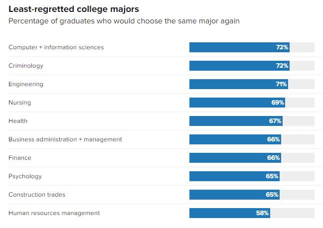 Παρόλα αυτά, μελέτη της ZipRecruiter που πραγματοποιήθηκε ανάμεσα σε 1.500 απόφοιτους πανεπιστημίων στις ΗΠΑ που αναζητούν εργασία, δείχνει ότι το 44% μετανιώνει για το αντικείμενο των σπουδών που επέλεξε.