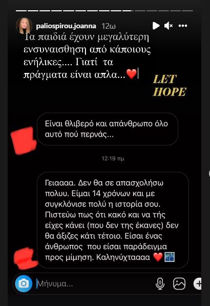 Την Κυριακή η Ιωάννα Παλιοσπύρου ξεχώρισε το μήνυμα που της έστειλε ένα παιδί 14 ετών το οποίο αρχικά της είπε ότι «είναι θλιβερό και απάνθρωπο όλο αυτό που περνάς». Στη συνέχεια, δε, το 14χρονο παιδί είπε στην Ιωάννα Παλιοσπύρου: