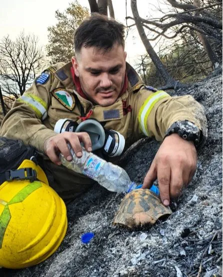 Είναι φωτογραφία του Άκη Μπαρδάκη, ο οποίος έγινε πρόσφατα πατέρας και κάνει τον γύρο στα social media σκορπίζοντας συγκίνηση την ώρα που δίνει νερό στη χελώνα μέσα σε ένα τοπίο που μόλις έχει καεί. Είναι ένας από τους πολλούς πυροσβέστες που βρέθηκαν στη φωτιά στη Δροσιά και την Πτέρη Αχαΐας που έκαψε εκτάσεις και ζώα.
