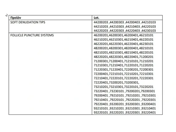 Παράλληλα, ο ΕΟΦ αποφάσισε την ανάκληση των παρτίδων του παρακάτω πίνακα των ιατροτεχνολογικών προϊόντων Κατηγορίας MDD Class IIa, SOFT DENUDATION TIPS + FOLLICLE PUNCTURE SYSTEMS λόγω του ότι κατά την διάρκεια της αξιολόγησης του κινδύνου, η ασφάλεια των προϊόντων δεν μπορεί να επιβεβαιωθεί αποδεδειγμένα, ιδίως όσον αφορά την εμβρυοτοξικότητα.
