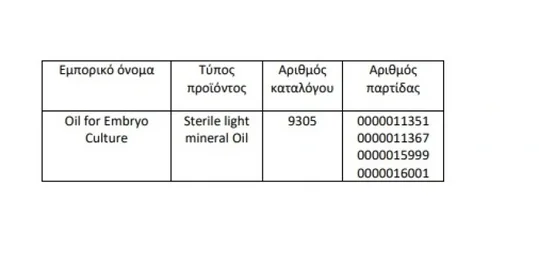 Ειδικότερα, ο Εθνικός Οργανισμός Φαρμάκων ανακοίνωσε την ανάκληση παρτίδων των ιατροτεχνολογικών προϊόντων του παρακάτω πίνακα μετά από ενημέρωση της κατασκευάστριας εταιρείας FUJIFILM Irvine Scientific Inc καθώς ανιχνεύτηκε τοξικότητα του λαδιού της καλλιέργειας που μπορεί να προκαλέσει βλάβη στην ανάπτυξη του εμβρύου και ανεπαρκή ανάπτυξη βλαστοκύστης ή μη μεταβιβάσιμη βλαστοκύστη με αποτέλεσμα στην αδυναμία διενέργειας της διαδικασίας με το εξασθενημένο έμβρυο.