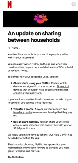 Το Netflix ξεκίνησε ήδη να στέλνει emails στις ΗΠΑ σε συνδρομητές που μοιράζονται τον λογαριασμό τους και μπορείτε να δείτε την εικόνα παρακάτω: