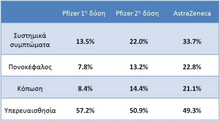 Στο σύνολο των εμβολιασθέντων, 25,4% ανέφεραν μία ή περισσότερες συστημικές παρενέργειες -άσχετες δηλαδή με το σημείο ένεσης- και 66,2% τοπικές. Ειδικότερα, για το εμβόλιο της Pfizer τα ποσοστά ανήλθαν σε 13,5% και 22% μετά την πρώτη και δεύτερη δόση αντίστοιχα, ενώ για την πρώτη δόση της AstraZeneca 33,7%.