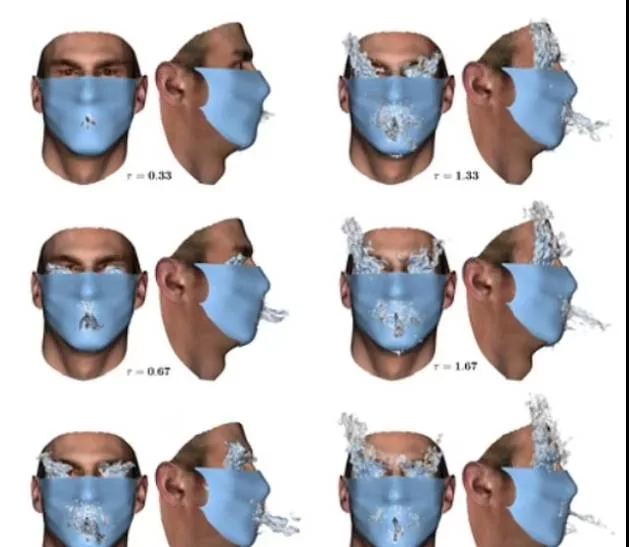 Ειδικοί από το State University της Φλόριντα και το Πανεπιστήμιο Johns Hopkins έκαναν προσομοιώσεις 3D σε υπολογιστή με βάση 100 άνδρες και 100 γυναίκες. Προσομοίωσαν ένα πίδακα βήχα από το στόμα των μοντέλων, το οποίο φορούσε μια υφασμάτινη μάσκα πάνω από τη μύτη και το στόμα και ελαστικούς κρίκους τυλιγμένους γύρω από τα αυτιά.
