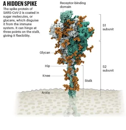 Πολλοί ιοί έχουν γλυκάνες που καλύπτουν τις εξωτερικές πρωτεΐνες τους και τις καμουφλάρουν αποκρύπτοντάς τις από το ανοσοποιητικό σύστημα. Ερευνητές, όμως, δημιούργησαν μία λεπτομερή απεικόνιση αυτού του καλύμματος βασισμένη σε δομικά και γενετικά δεδομένα, που τελικά ανασυντέθηκε άτομο προς άτομο από έναν υπερυπολογιστή, δίνοντας μία εξαιρετικά λεπτομερή απεικόνιση. Μέσα από αυτό το κάλυμμα, όμως, ξεχωρίζει ένας μη επικαλυμμένος βρόχος, ο οποίος είναι ένα τμήμα της πρωτεΐνης-ακίδας που αποτελεί τον τομέα δέσμευσης του υποδοχέα (RBD), ένα από τα τρία τμήματα της ακίδας που συνδέονται με τους υποδοχείς ACE2 στα ανθρώπινα κύτταρα.