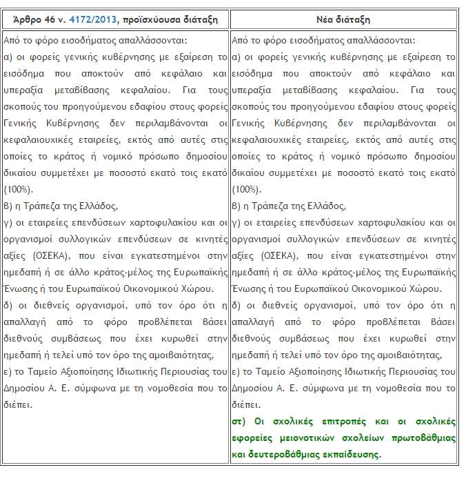 Με το ψηφισθέν νομοσχέδιο "Ενσωμάτωση στην εθνική νομοθεσία της Οδηγίας 2014/92/ΕΕ του Ευρωπαϊκού Κοινοβουλίου και του Συμβουλίου της 23ης Ιουλίου 2014 για τη συγκρισιμότητα των τελών που συνδέονται με λογαριασμούς πληρωμών, την αλλαγή λογαριασμού πληρωμών και την πρόσβαση σε λογαριασμούς πληρωμών με βασικά χαρακτηριστικά και άλλες διατάξεις." επέρχεται μια σημαντική αλλαγή που αφορά στη φορολογία εισοδήματος.Πιο συγκεκριμένα με το άρθρο 62 αυτού, προστίθεται νέα περίπτωση στ' στο άρθρο 46 του Κ.Φ.Ε. με την οποία ορίζεται ότι από 01-01-2016 και μετά, απαλλάσσονται του φόρου εισοδήματος οι σχολικές επιτροπές και οι σχολικές εφορείες μειονοτικών σχολείων πρωτοβάθμιας και δευτεροβάθμιας εκπαίδευσης.Σημείωση i: Το νομοσχέδιο αυτό δεν έχει δημοσιευθεί ακόμα στην Εφημερίδα της Κυβερνήσεως.Σημείωση ii: Η ανωτέρω απαλλαγή ισχύει από 1/1/2016 και μετά. Σημείωση iii: Μετά τη δημοσίευση του νομοσχεδίου στο ΦΕΚ, προφανώς δεν θα ισχύει το πρόσφατο έγγραφο της Α.Α.Δ.Ε. υπ' αριθμ. ΔΕΑΦ Β 1016062 ΕΞ 2017/1.2.2017.Πηγή: https://www.taxheaven.grhttp://www.alfavita.gr/