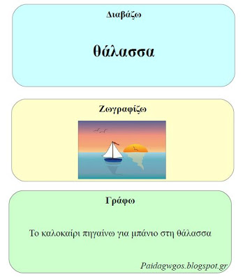 Η άσκηση έχει στόχο τη βελτίωση στην ανάγνωση και την γραπτή έκφραση. Μπορεί να γίνει σε παιδιά όλων των τάξεων με θέμα ανάλογο της ηλικίας αλλά και των δυσκολιών του κάθε παιδιού.Σε ένα χαρτί σχεδιάζουμε 3 ορθογώνια. Στο πρώτο γράφουμε τον τίτλο "Διαβάζω", στο δεύτερο τον τίτλο "Ζωγραφίζω" και στο τρίτο "Γράφω". Η άσκηση μπορεί να γίνει με τρεις τρόπους:- Γράφουμε μια λέξη στο πρώτο κουτί, έπειτα ζητάμε από το παιδί να την ζωγραφίσει στο δεύτερο κουτί και στο τρίτο να αντιγράψει τη λέξη ή να φτιάξει μια πρόταση με αυτήν. - Ζωγραφίζουμε (ή κολλάμε μια εικόνα/ αυτοκόλλητο) στο δεύτερο κουτί και ζητάμε από το παιδί να συμπληρώσει τα άλλα δύο κουτιά.- Γράφουμε μια πρόταση στο τρίτο κουτί, ζητάμε από το παιδί να βρει το ουσιαστικό και να συμπληρώσει τα προηγούμενα κουτιά. Για μεγαλύτερο βαθμό δυσκολίας χρησιμοποιούμε πιο δύσκολες λέξεις ενώ σε μικρά παιδιά δίνουμε απλές καθημερινές λέξεις. Σοφία ΤσιντσικλόγλουΕιδική Παιδαγωγόςpaidagwgos.blogspot.gr