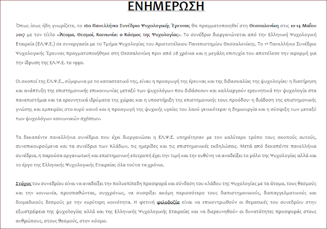 10-14 Μαϊου 2017: το 16ο Πανελλήνιο Συνέδριο Ψυχολογικής Έρευνας στη Θεσσαλονίκη (όπου 28 χρόνια πριν είχε πραγματοποιηθεί το 1ο Πανελλήνιο Συνέδριο Ψυχολογικής Έρευνας)