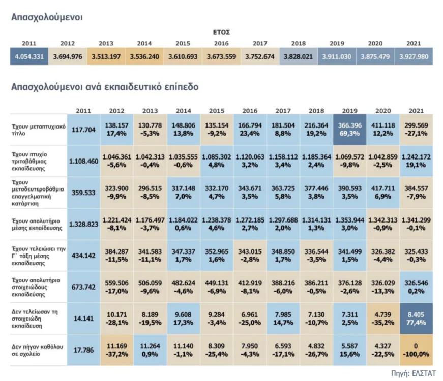 Πτώση καταγράφηκε το 2021 κατά 27,13% σε 299.659 απασχολούμενους. Πτώση όμως κατά 55,93%, παρουσίασαν το 2021 και οι άνεργοι με μεταπτυχιακό τίτλο. Τα δύο αυτά γεγονότα πιθανά συσχετίζονται είτε με την έξοδο του εργατικού δυναμικού με μεταπτυχιακό από τον οικονομικά ενεργό πληθυσμό είτε με την απασχόληση τους εκτός της χώρας.»
