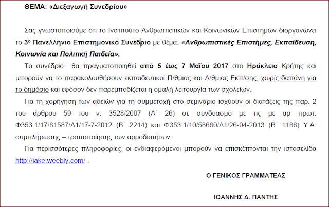5-7 Μαϊου 2017: 3ο Πανελλήνιο Επιστημονικό Συνέδριο με θέμα “Ανθρωπιστικές Επιστήμες, Εκπαίδευση, Κοινωνία και Πολιτική Παιδεία” στο Ηράκλειο Κρήτης