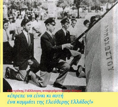 Ο πρώτος μαθητής που έπεσε στον αγώνα, ο Πετράκης Γιάλλουρος από την επαρχία Αμμοχώστου, φοιτούσε στην έκτη γυμνασίου. Στις 6 Φεβρουαρίου 1956 μαθητές του Γυμνασίου Αμμοχώστου οργανώνουν διαδηλώσεις διαμαρτυρίας για το κλείσιμό του σχολείου τους φωνάζοντας «ΕΟΚΑ» και «ΕΝΩΣΗ», ενώ οι Άγγλοι στρατιώτες τους ρίχνουν δακρυγόνα. Ο αρχηγός και σημαιοφόρος των μαθητών, ο δεκαοκτάχρονος ιδεολόγος Πετράκης Γιάλλουρος, δεν πτοείται, αλλά ανεμίζει περήφανα τη γαλανόλευκη και σκορπίζει ρίγη ενθουσιασμού στον κόσμο που περνά. Οι κατακτητές τον χτυπούν στο χέρι και στο στήθος, και το παλληκάρι ξεψυχά αναφωνώντας «Ζήτω η Ένωση». Κηδεύεται στη γενέτειρά του Ριζοκάρπασο, μέσα στη νύχτα και στη βροχή, σε συνθήκες συγκίνησης και πατριωτικής έξαρσης. Ο καθηγητικός σύλλογος και οι συμμαθητές του ψάλλοντας τον εθνικό ύμνο τυλίγουν τη σωρό του με την ελληνική σημαία και τη συνοδεύουν στην τελευταία της κατοικία![]()