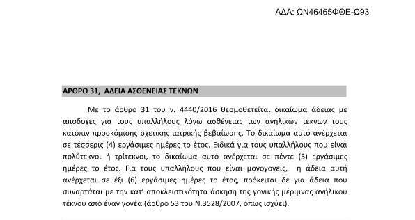 ΥΠ.ΔΙΟΙΚ.ΑΝΑΣ. ΔΙΔΑΔ/Φ.49Κ/5/ΟΙΚ.32342/19-12-16 : Εφαρμογή των διατάξεων του ν. 4440/16 “Ενιαίο Σύστημα Κινητικότητας στη Δημόσια Διοίκηση και την Τοπική Αυτοδιοίκηση, υποχρεώσεις των προσώπων που διορίζονται στις θέσεις των άρθρων 6 και 8 του ν. 4369/16, ασυμβίβαστα και πρόληψη των περιπτώσεων σύγκρουσης συμφερόντων και λοιπές διατάξεις” (Α224), με το άρθρο 31 του ν. 4440/2016, θεσμοθετείται δικαίωμα άδειας με αποδοχές για τους υπαλλήλους λόγω ασθενείας των ανηλίκων τέκνων τους κατόπιν προσκόμισης σχετικής ιατρικής βεβαίωσης.