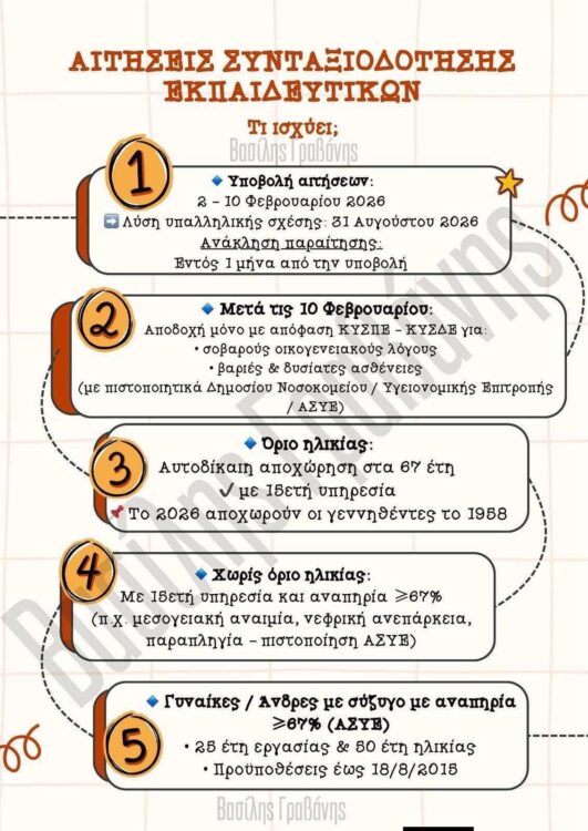 Σύμφωνα με τις πληροφορίες που μοιράζεται στην παρακάτω φωτογραφία ο εκπαιδευτικός Βασίλης Γραβάνης, η υποβολή αιτήσεων θα πραγματοποιηθεί από τις 2 έως τις 10 Φεβρουαρίου 2026. Η λύση της υπαλληλικής σχέσης τοποθετείται στις 31 Αυγούστου 2026, ενώ προβλέπεται δυνατότητα ανάκλησης της παραίτησης εντός ενός μήνα από την υποβολή της. Μετά τις 10 Φεβρουαρίου, αιτήματα γίνονται δεκτά μόνο κατόπιν απόφασης ΚΥΣΠΕ ή ΚΥΣΔΕ και αποκλειστικά για σοβαρούς οικογενειακούς λόγους ή για βαριές και δυσίατες ασθένειες, με την προσκόμιση πιστοποιητικών από Δημόσιο Νοσοκομείο, Υγειονομική Επιτροπή ή ΑΣΥΕ.