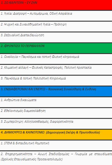 Μετά την επιτυχή πιλοτική εφαρμογή των Εργαστηρίων Δεξιοτήτων φέτος σε 218 Νηπιαγωγεία, Δημοτικά και Γυμνάσια, το προσεχές σχολικό έτος προγραμματίζεται η διδασκαλία τους σε όλα τα σχολεία της χώρας. Τα Εργαστήρια Δεξιοτήτων περιλαμβάνουν τέσσερις θεματικούς κύκλους, με υπο-θεματικές σταθμισμένες ανά ηλικία και εκπαιδευτική βαθμίδα: