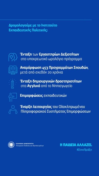Έρχονται αλλαγές στην εκπαίδευση – Το υπουργείο παιδείας, δημοσίευσε τις μεταρρυθμίσεις στην εκπαίδευση στο επίκεντρο διαδικτυακής συνάντησης εργασίας της υπουργού παιδείας, Νίκης Κεραμέως με την υφυπουργό, Ζέττα Μακρή και τον Πρόεδρο κύριο Γιάννη Αντωνίου αλλά και τα Μέλη του Διοικητικού Συμβουλίου του Ινστιτούτου Εκπαιδευτικής Πολιτικής.