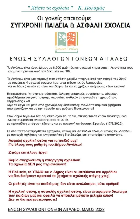Να δοθεί άμεσα λύση για τα σεισμόπληκτα σχολικά κτήρια του Αιγάλεω, ζητούν γονείς, εκπαιδευτικοί και διάφοροι φορείς.