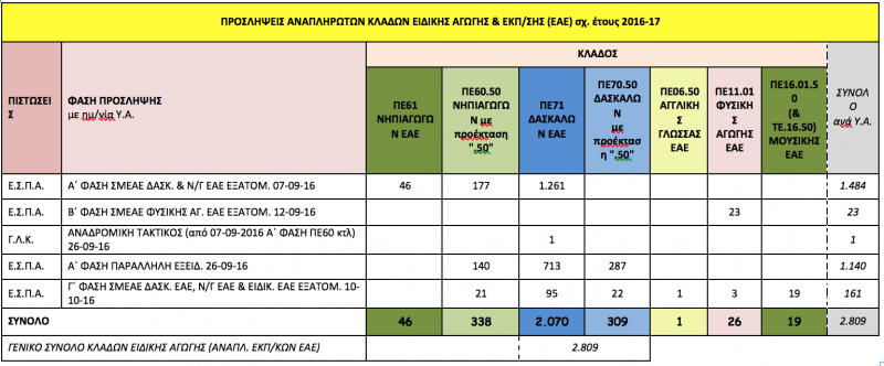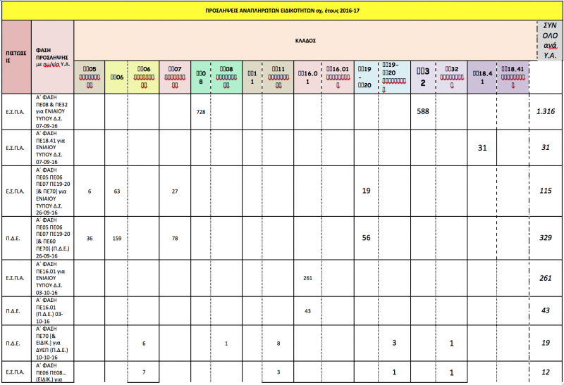 ΑΝΑΛΥΤΙΚΟΙ ΠΙΝΑΚΕΣ ΠΡΟΣΛΗΨΗΣ ΑΝΑΠΛΗΡΩΤΩΝ Α/ΘΜΙΑΣ ΕΚΠΑΙΔΕΥΣΗΣ ΕΩΣ 17/10/2016 Newsroom Ipaidia 17/10/2016 - 17:29 20161017172917/10/201617:29--20161017172917/10/201617:29 ΕΝΗΜΕΡΩΤΙΚΟ ΣΗΜΕΙΩΜΑ Του Αιρετού Κ.Υ.Σ.Π.Ε. Βασίλη Παληγιάννη Για την πληρέστερη ενημέρωσή σας, σας παραθέτω μετά από αίτημα συναδέλφων τους αναλυτικούς πίνακες πρόσληψης των αναπληρωτών στην Π.Ε. έως 17/10/2016 ανά φάση και ειδικότητα.