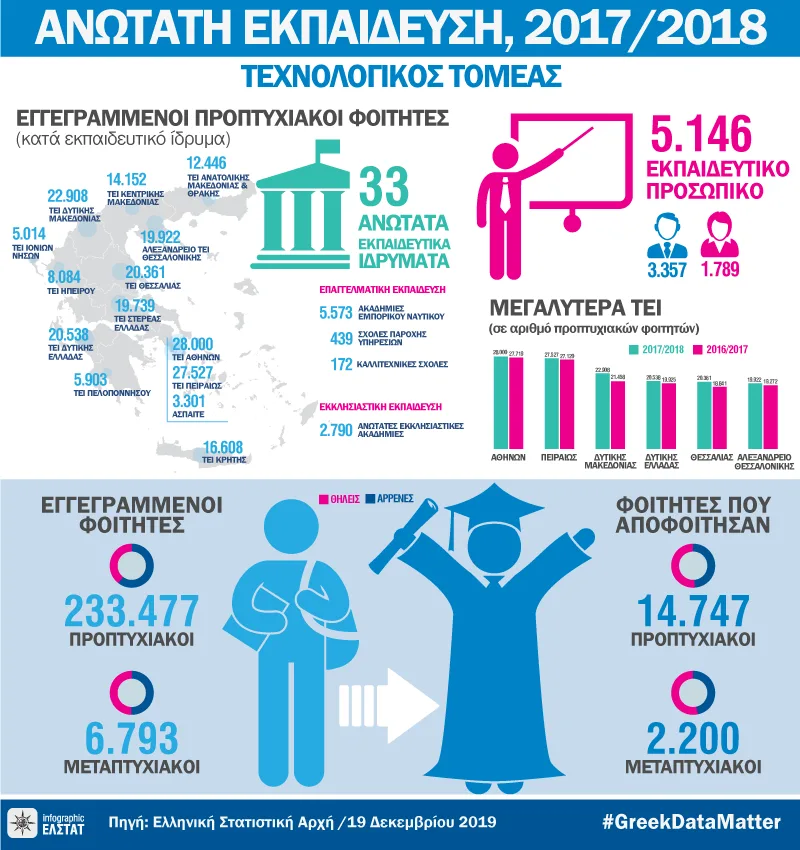 Σύμφωνα με την έρευνα της ΕΛΣΤΑΤ για τις στατιστικές Ανώτατης Εκπαίδευσης (Τεχνολογικός Τομέας), λήξης ακαδημαϊκού έτους 2017-2018: