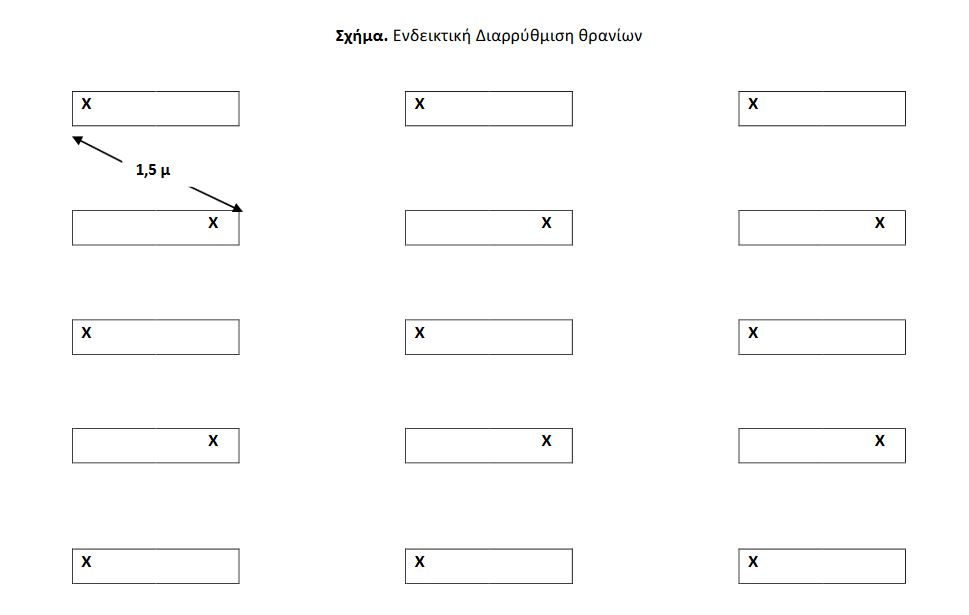 Προτείνεται τα θρανία να έχουν κοινό προσανατολισμό, ώστε να μειώνεται κατά το μέγιστο δυνατό η έκθεση των μαθητών σε σταγονίδια από βήχα ή φτέρνισμα, ιδιαίτερα σε αίθουσες με περιορισμένο χώρο (βλ. σχήμα που ακολουθεί).