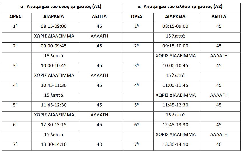 Προκειμένου να περιοριστεί η αλληλεπίδραση μεταξύ των τμημάτων/υποτμημάτων είναι σημαντικό να υιοθετηθούν πρακτικές συστηματικού διαχωρισμού των μαθητών και κατά τα διαλείμματα. Προτείνεται η υιοθέτηση του ακόλουθου ωραρίου διαλειμμάτων για κάθε υποτμήμα εκάστου τμήματος.