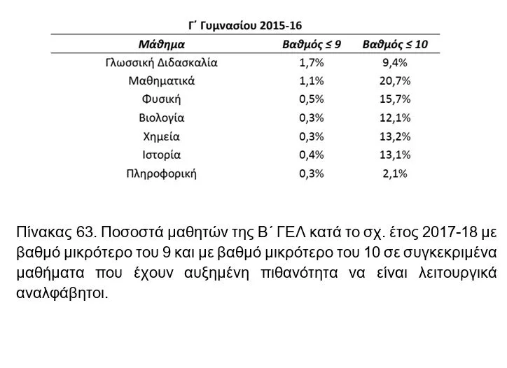 Πίνακας 62. Ποσοστά μαθητών της Γ΄ Γυμνασίου κατά το σχ. έτος 2015-16 με βαθμό μικρότερο του 9 και με βαθμό μικρότερο του 10 σε συγκεκριμένα μαθήματα που έχουν αυξημένη πιθανότητα να είναι λειτουργικά αναλφάβητοι.