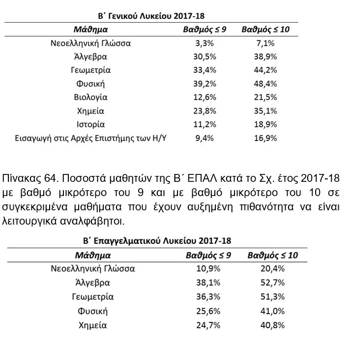 Πίνακας 63. Ποσοστά μαθητών της Β΄ ΓΕΛ κατά το σχ. έτος 2017-18 με βαθμό μικρότερο του 9 και με βαθμό μικρότερο του 10 σε συγκεκριμένα μαθήματα που έχουν αυξημένη πιθανότητα να είναι λειτουργικά αναλφάβητοι.