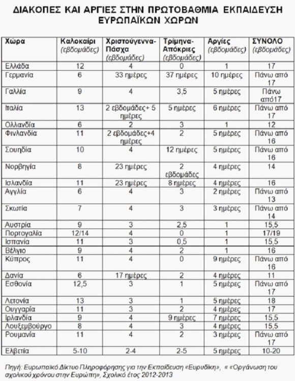 Το δείχνουν τα στοιχεία του Ευρωπαϊκού Δικτύου Πληροφόρησης για την εκπαίδευση «Ευρυδίκη» σχετικά με τις διακοπές και αργίες στην Πρωτοβάθμια εκπαίδευση.