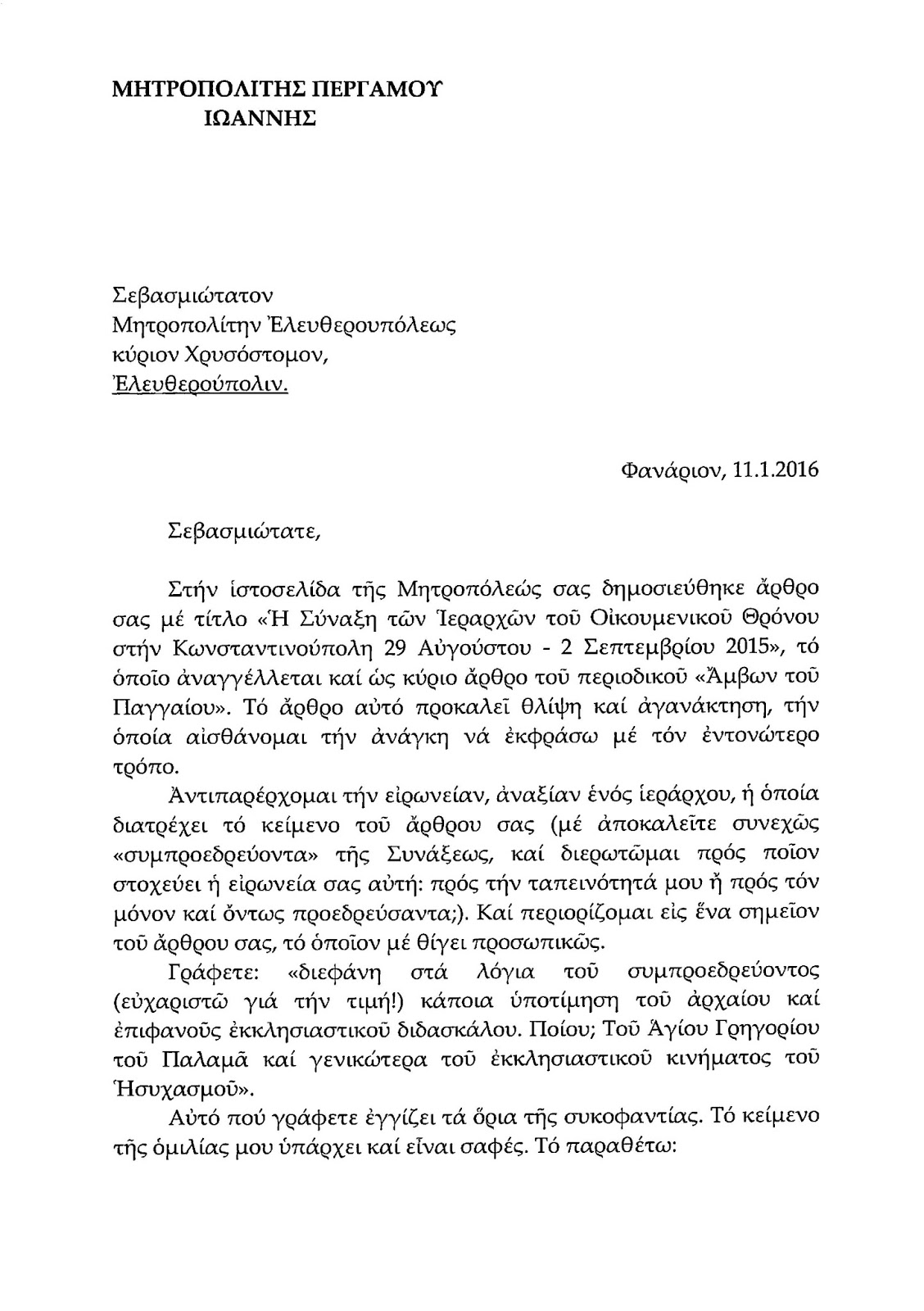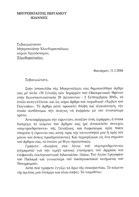 Με αφορμή άρθρο του Μητροπολίτου Ελευθερουπόλεως Χρυσοστόμου με τίτλο «Ἡ Σύναξη τῶν Ἱεραρχῶν τοῦ Οἰκουμενικοῦ Θρόνου στήν Κωνσταντινούπολη (29 Αὐγούστου – 2 Σεπτεμβρίου 2015)» ο Μητροπολίτης Περγάμου Ιωάννης απέστειλε επιστολή προς εκείνον στην οποία τοποθετήθηκε ο Μητροπολίτης Χρυσόστομος μέσω της ιστοσελίδας της Μητροπόλεως του.