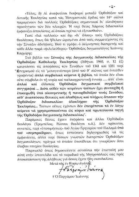 Ἔτσι ἑρμηνεύομε καὶ τὸ ἐκτάκτως δριμὺ καὶ ὀξυβελὲς ὕφος τῆς ἐπιστολῆς τοῦ διαπρεποῦς ἀκαδημαικοῦ διδασκάλου τῶν ἡμερῶν μας. Διότι ἐνόμισε ὅτι ὁ ὑποφαινόμενος ἐσκόπευε νὰ τὸν θίξει στὸ σπουδαῖο κεφάλαιο τῆς πίστεως. Ἀλλὰ ὁ συντάκτης τοῦ ἄρθρου τίποτε ἄλλο δὲν περιέλαβε παρὰ μόνο ὅ,τι «ἐξ ἀντικειμένου» εἶδε καὶ ἄκουσε, ὡς ἕνας ἀπὸ τοὺς μετασχόντες στὴν γνωστὴ Σύναξη τοῦ Φαναρίου τοῦ παρελθόντος ἔτους. Καὶ θὰ παρέλειπε τὸ σημεῖο ἐκεῖνο, πού ἀφοροῦσε τὸν ἅγιο Περγάμου, ἐὰν δὲν ἐνεθυμεῖτο, ὅτι «ἀντέστη» εὐθαρσῶς στὶς διατυπωθεῖσες ἀπόψεις του περὶ τοῦ Ἡσυχασμοῦ καὶ τοῦ ἁγίου πρωταγωνιστοῦ του ὄχι τυχαῖο μέλος τῆς Συνάξεως τῶν ἀρχιερέων, ἀλλὰ νέος ἀρχιερεὺς, ἐπίσης ἀκαδημαϊκὸς διδάσκαλος καὶ μάλιστα τοῦ κλίματος τοῦ Οἰκουμενικοῦ Πατριαρχείου.