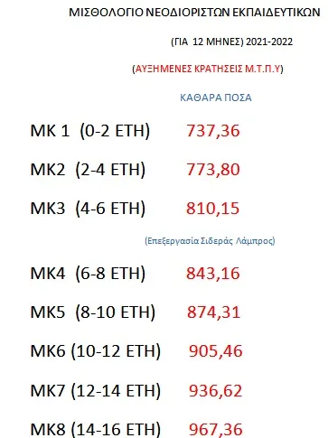 Διορισμοί εκπαιδευτικών: Tα καθαρά ποσά των νεοδιόριστων εκπαιδευτικών.Για τους πρώτους 12 μήνες διορισμού εκπαιδευτικού σε μόνιμη θέση υπάρχουν αυξημένες καταβολές για το Μετοχικό Ταμείο των Πολιτικών Υπαλλήλων.