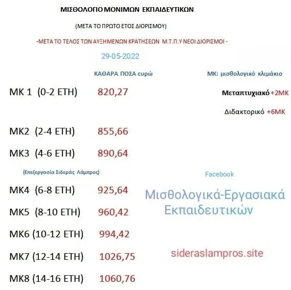 Πίνακας με επιμέλεια του εκπαιδευτικού Λάμπρου Σιδερά για το μισθολόγιο μόνιμων εκπαιδευτικών μετά το πρώτο έτος διορισμού.