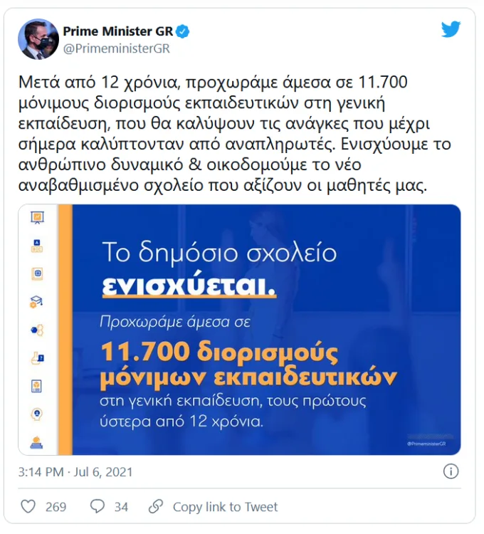 O πρωθυπουργός σημείωσε: «Μετά από 12 χρόνια, προχωράμε άμεσα σε 11.700 μόνιμους διορισμούς εκπαιδευτικών στη γενική εκπαίδευση, που θα καλύψουν τις ανάγκες που μέχρι σήμερα καλύπτονταν από αναπληρωτές. Ενισχύουμε το ανθρώπινο δυναμικό & οικοδομούμε το νέο αναβαθμισμένο σχολείο που αξίζουν οι μαθητές μας».