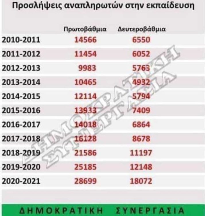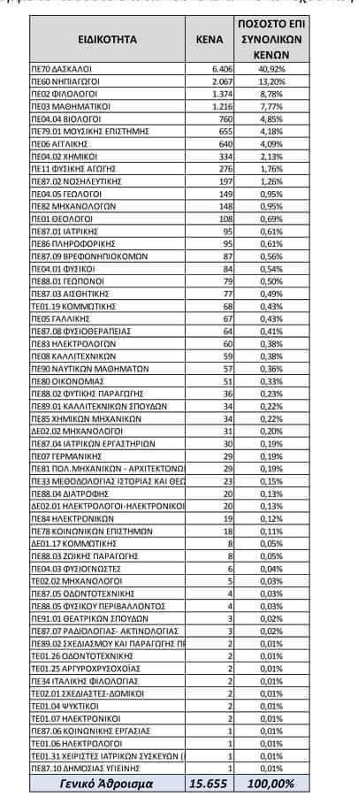 Αφαιρώντας τις 700 οργανικές θέσεις των ειδικοτήτων, υπολείπονται 11.000 διορισμοί σε Αθμια και Βθμια Εκπαίδευση, με βάση τα παρακάτω οργανικά κενά.