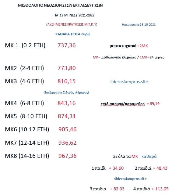 Θα είναι μαζεμένο ένα καλό ποσό.Το ΜΚ θα είναι το 1+επίδομα παιδιών μέχρι την αναγνώριση της προϋπηρεσίας(ανάλογα την διεύθυνση).Δείτε εδώ τα καθαρά ποσά για πρώτο έτος: