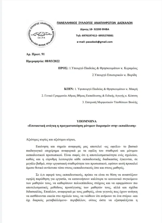 Διορισμοί εκπαιδευτικών: Επιτακτική ανάγκη η πραγματοποίηση μόνιμων διορισμών στην εκπαίδευση, ανέφερε σε ενημέρωση του ο Πανελλήνιος Σύλλογος Αναπληρωτών Δασκάλων.