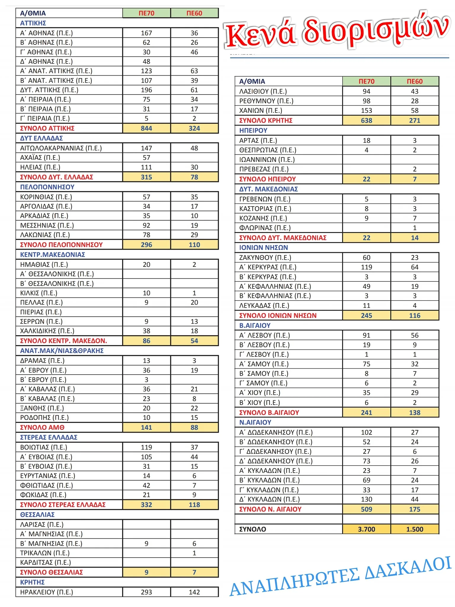 Πίνακας με τα κενά που προσφέρονται για διορισμούς εκπαιδευτικών σε πρωτοβάθμια και δευτεροβάθμια εκπαίδευση δημοσίευτηκε στη σελίδα Αναπληρωτές Δάσκαλοι