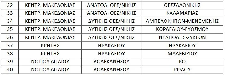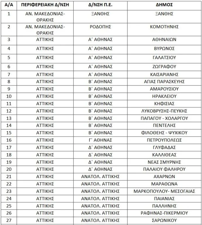Η λίστα με το σύνολο των 40 Δήμων που το μέτρο θα εφαρμοστεί από την σχολική χρονιά 2020-2021 :