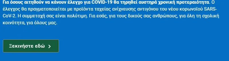 Για όσους αιτηθούν να κάνουν έλεγχο για COVID-19 θα τηρηθεί αυστηρά χρονική προτεραιότητα. Ο έλεγχος θα πραγματοποιείται με προϊόντα ταχείας ανίχνευσης αντιγόνου του νέου κορωνοϊού SARS-CoV-2. Η συμμετοχή σας είναι πολύτιμη. Για εσάς, για τους δικούς σας ανθρώπους, για όλη τη σχολική κοινότητα, για όλους μας.