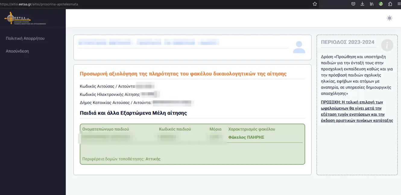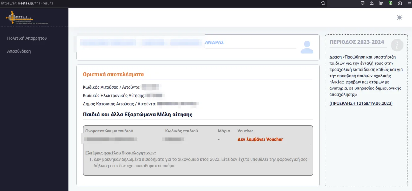 Στα προσωρινά αποτελέσματα είχαμε πλήρη φάκελο και στα οριστικά δεν δικαιούμαστε λόγω του ότι δεν βρέθηκαν δηλωμένα εισοδήματα για το 2022!!